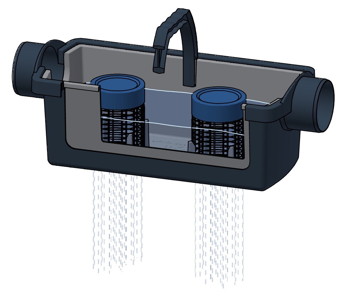Ein robuster Filter aus Edelstahl (Spaltweite 0,8 mm) gewährleistet eine optimale Kombination von Filterleistung und Wartungsfreundlichkeit. Verunreinigungen werden aus dem Behälter gespült, bevor sie in den eigentlichen Regenspeicher gelangen. Eine auf die Konusgeometrie abgestimmte Halterung aus PE-HD sorgt für einen dichten und stabilen Anschluss des Edelstahls-Patronenfilters und erlaubt den freien Durchstieg in den Regenspeicher.