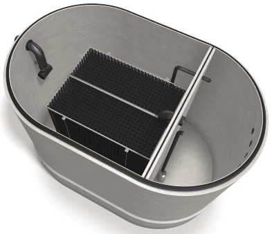Schlammfang und Entnahmebecken sind getrennt vom Ovalbehälter angeordnet.